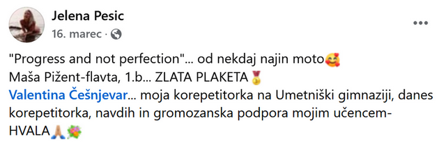 MAŠA PIŽENT - ZLATA PLAKETA (MENTORICA JELENA PEŠIĆ, KOREPETITORKA VALENTINA ČEŠNJEVAR)