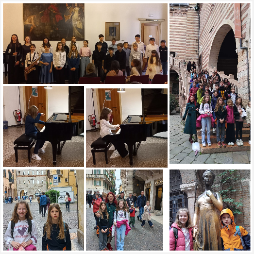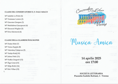 Na pobudo kolegice Vesne Zuppin in ob veliki podpori ravnatelja Glasbene šole Koper Iztoka Babnika, ki se je velikodušno odločil, da vse letošnje tekmovalce nagradi z izletom v Verono – nam bo ponedeljek, 14. april, ostal v lepem spominu. Kljub nekoliko slabšemu vremenu so bile ulice Verone videti čarobne. Občudovali smo veličastno in starodavno Areno, ko smo se večkrat sprehodili mimo nje. Obiskali smo "zaščitni znak Verone" - Julijin kipec in ta trenutek seveda ovekovečili s fotografijo. Osrednji dogodek je bil skupni koncert najobetavnejših tekmovalcev naše šole in nadarjenih gojencev Conservatorija Dall'Abaco iz Verone, ki ga je za nas organizirala profesorica Isabella Lo Porto v čudovito lepi dvorani Società Letteraria v samem središču Verone. Na koncertu so nastopili tudi tekmovalci iz razreda prof. Valentine Češnjevar - Inti Gutman in Manu Miraj Privošnik.![]()