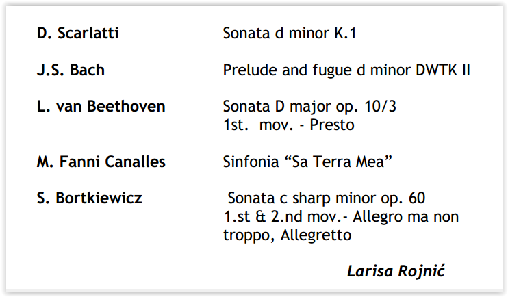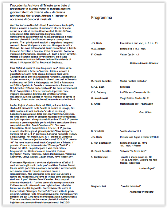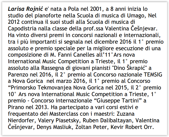 Kot absolutna zmagovalka B kategorije 11. Ars Nova tekmovanja "Paolo Spincich" je na povabilo organizatorja dijakinja UG Larisa Rojnić iz razreda prof. Valentine Češnjevar 24. 4. 2017 nastopila v teatru Miela. Predstavila se je z 25 minutnim recitalom in za svoj suveren nastop požela gromek aplavz.